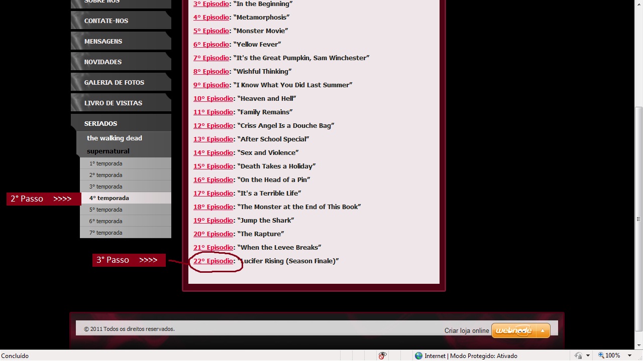 2° Passo: Apos ter clicado no seriado escolhido, na tela principal tera informaçoes e noticias sobre o mesmo. Embaixo da aba seriados, ou seja nas subpaginas, estarao as temporadas disponiveis. Apos escolher a sua, basta clicar e escolher na pagina seguinte, o arquivo para download.Já na pagina seguinte, basta clicar no numero do episodio, nao no nome, assim como na figura abaixo: